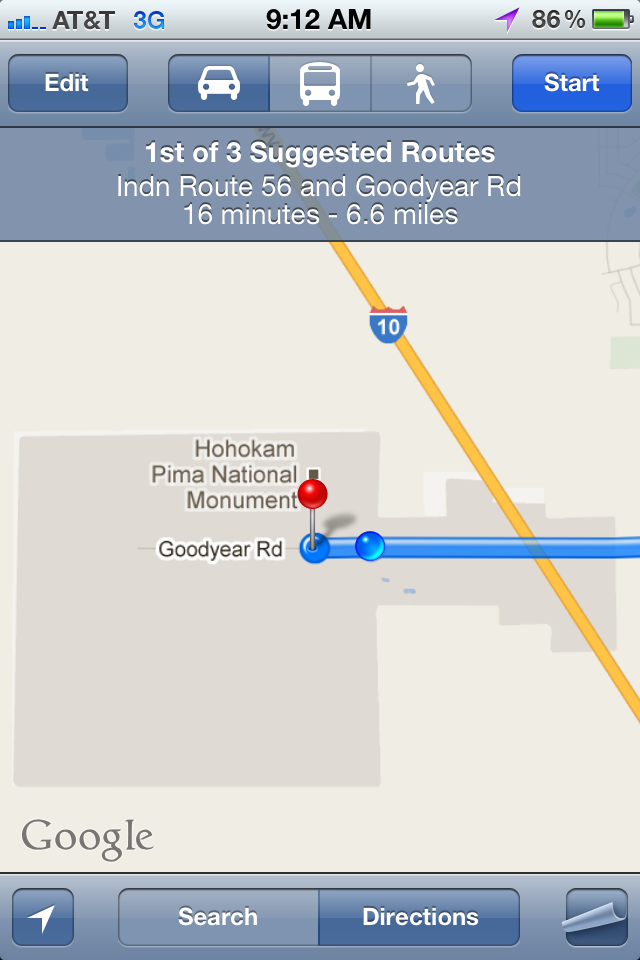 Upon leaving Phoenix, our first stop was Hohokam Pima National Monument. The problem is, in our quest to get stamps from and visit every National Park Site in the country, Hohokam Pima is completely inaccessible to the public. There is no stamp and no visitors center. It is owned by the Gila River Indian Community and they are not allowing visitors to the site at this time. Though we wanted to respect the community, we also wanted to say we had been there. So we entered the location into our GPS, drove down a dirt road, and waited until the GPS said we were inside the park before we turned around. We took a photo of the GPS to prove we were there. How nerdy are we? And I just found this statement on their website, “Attempting to go to the site is trespassing.” Oops. We didn’t see any “No Trespassing” signs where we were, and did not attempt to go to the actual site – which apparently protects an ancient Hohokam village called Snaketown.