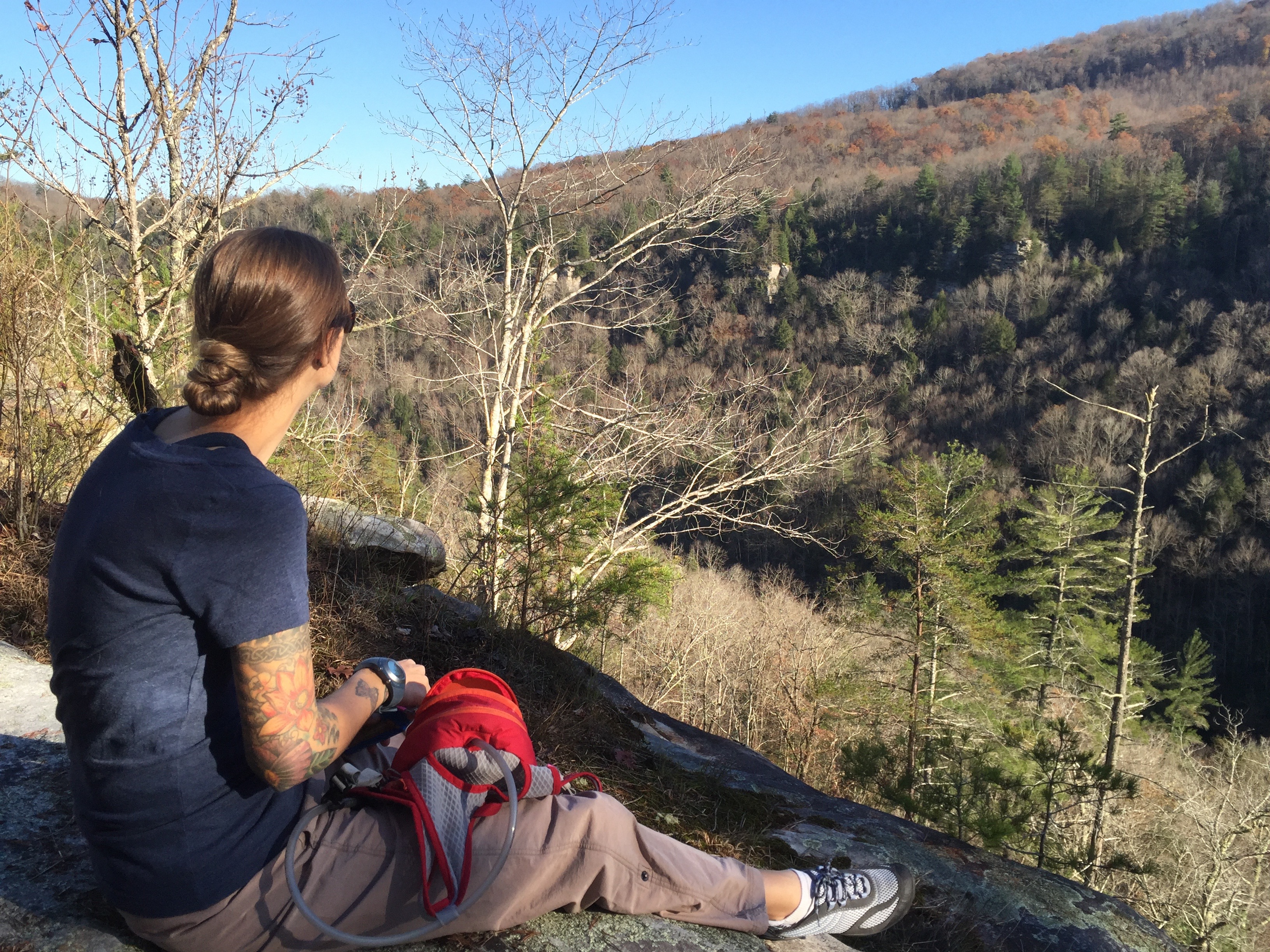 Veterans Day is a great day to pay tribute to our country, and to America’s Best Idea – the National Park System. This Veterans Day, Anthony and I both had off so we decided to spend it at a park site we hadn’t visited yet – Obed Wild and Scenic River in Tennessee. Not too far from our house, this site boasts hiking trails and many opportunities to paddle the river. We started our visit in the nearby town of Wartburg, at the visitors center. As usual, there was a film to watch, which we always love, discussing the history of the area and the organizations that fought to preserve it. We then took a hike from Lilly Bluff out to The Point, overlooking the river. The views from the beginning of our hike, at Lilly Bluff, were actually the best we had. High above the river, we peered down at sandstone cliffs and rapid cataracts. Our hike was an out and back, taking us along leafy trails through flat forest. The view from The Point again looked down on the river, actually the confluence of the Obed River and Clear Creek. We paused to enjoy the view and eat a snack before heading back the way we came. We drove through some of the park, but it is best seen from the water, which we were unfortunately not prepared to do, but we enjoyed our visit nonetheless. Making it even better, was our stop at Woodlands Indian Restaurant on the way home. They have a separate vegan menu, and we both enjoyed our dinners immensely.